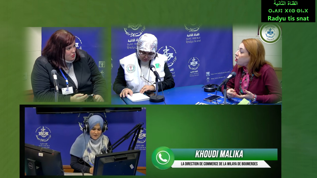 ⴰⴳⴰⵣⵉ 25.12.2024. AGAZI. Par Djamila Louani sur les boissons énergisantes. Les invités sont :Dr Hamouch lilia psychiatre, Mme lateb cylia nutritionniste, Mme Mekhiouba samia , représentantes de L’Association nationale des professionnels pour la sauvegarde de la santé , intervention par téléphone avec Khoudi Mlika la direction de commerce de la Wilaya de Boumerdes et l'association de protection de consommateur Lahlou mokrani , et reportage sur terrain avec Atman Hadid, Kahina Ben Zidan et Haoda Achour.
